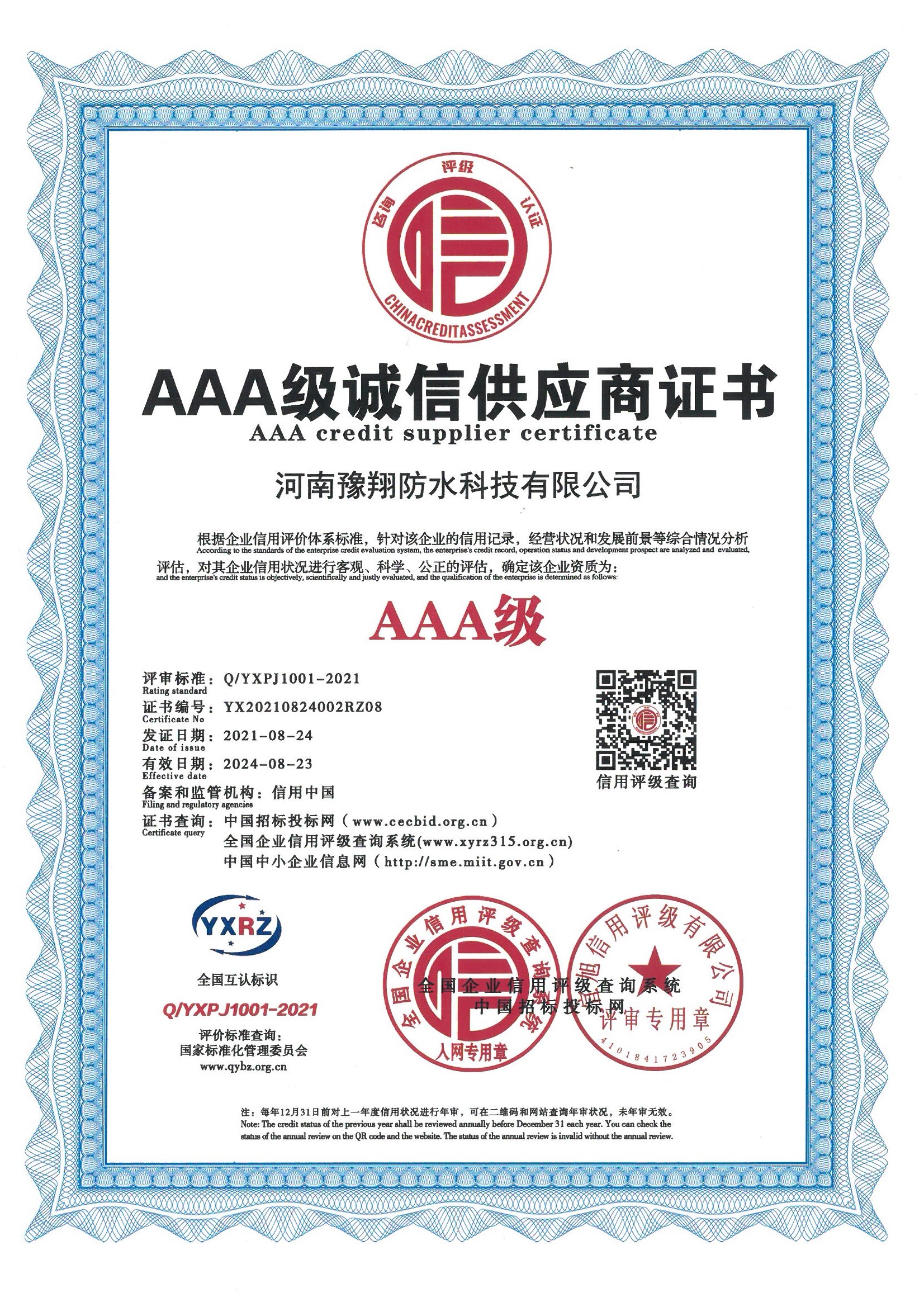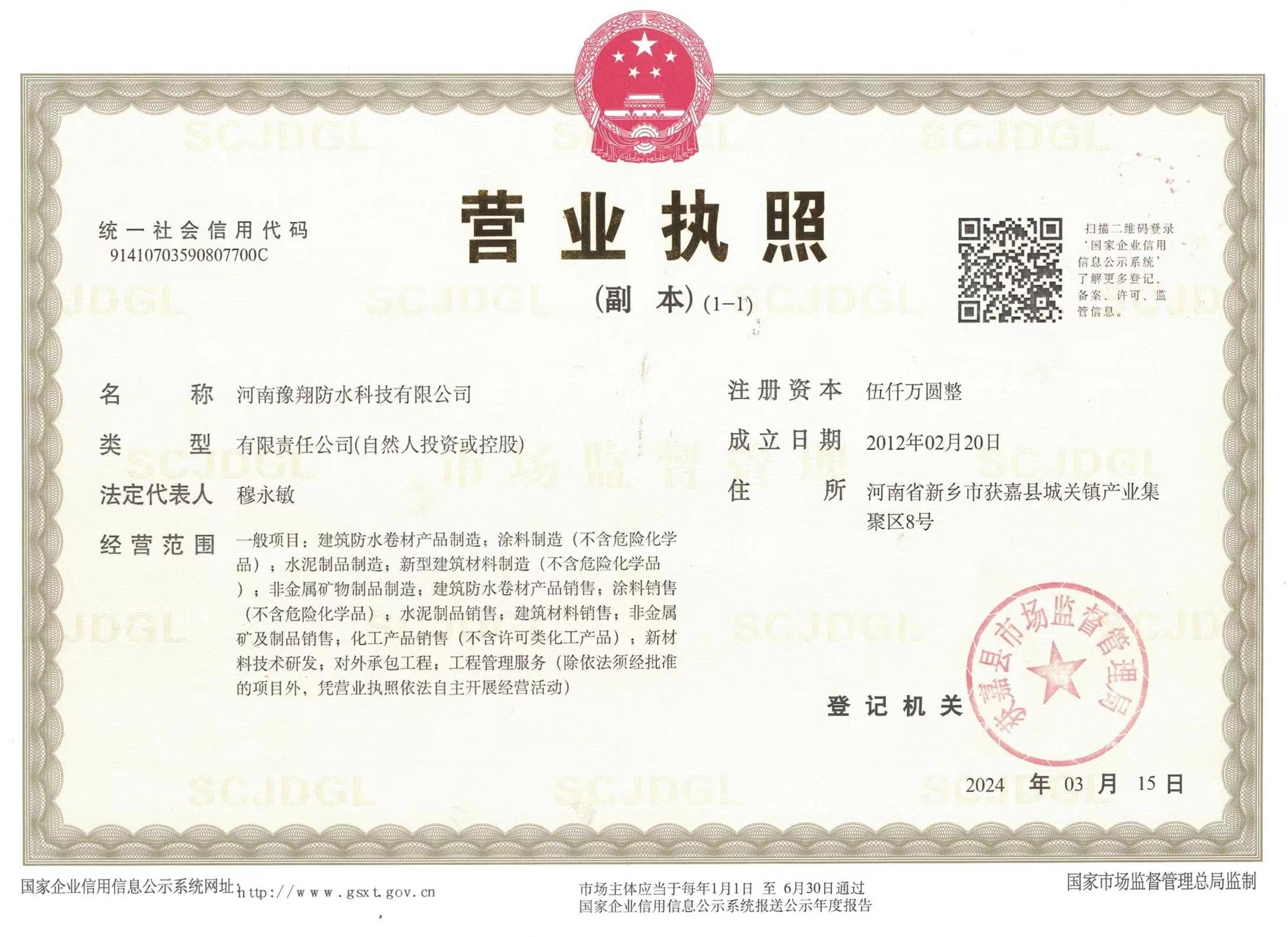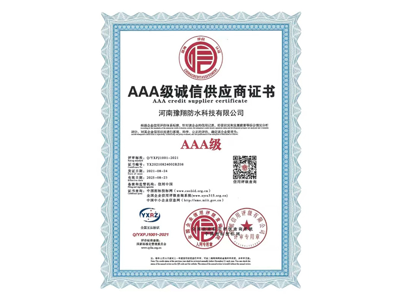 公司是中國建筑防水協(xié)會會員單位、河南省建筑防水協(xié)會會員單位、中國中鐵建筑CRCC認(rèn)證合作單位、中國中輕產(chǎn)品質(zhì)量保障CQGC認(rèn)證單位、國家康居示范工程產(chǎn)品單位、中國綠色環(huán)保家裝產(chǎn)品推廣單位、全國道橋高分子防水涂料國家標(biāo)準(zhǔn)參編單位,連續(xù)多年被評為“中國3.15誠信企業(yè)”、河南省“守合同重信用企業(yè)”。